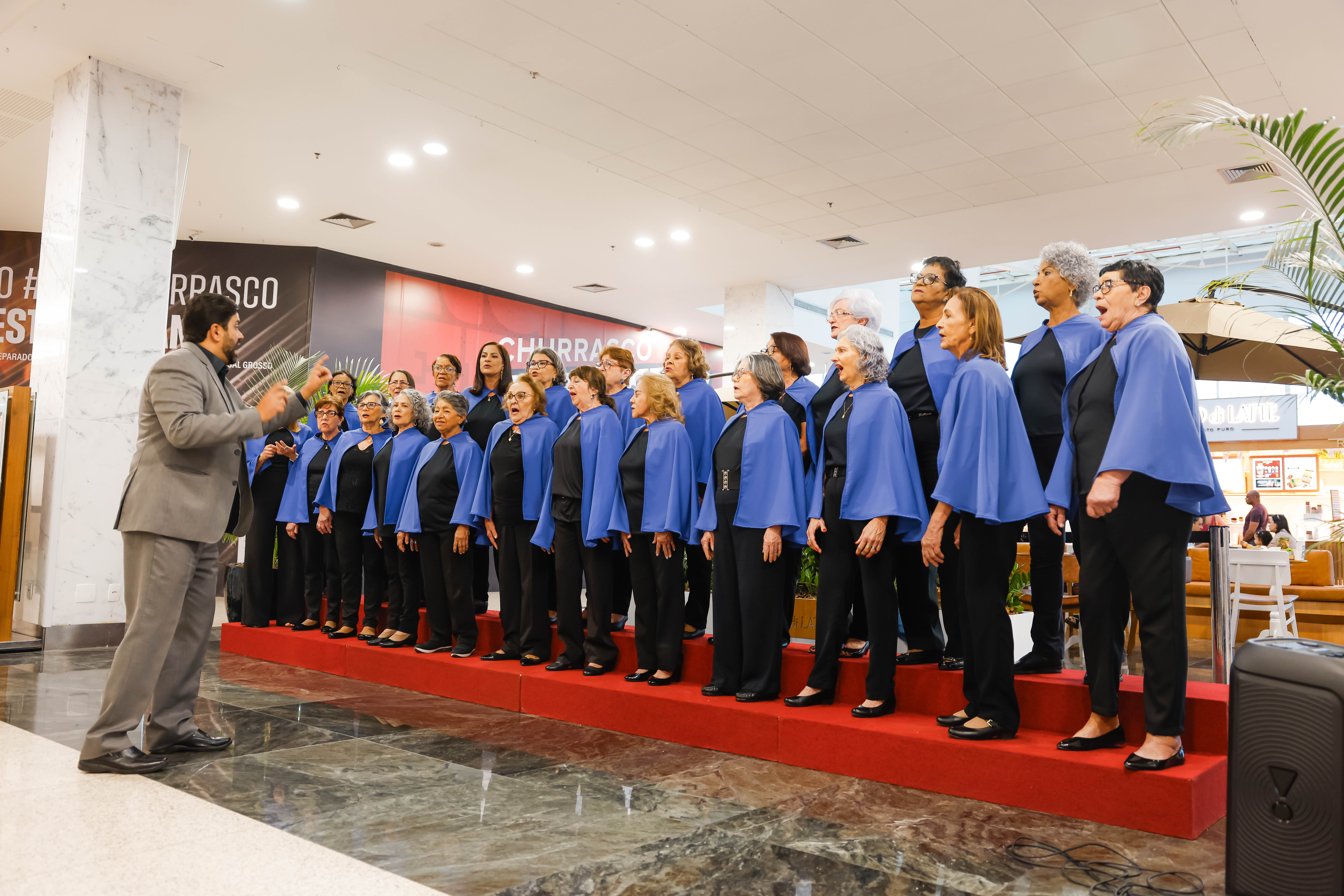 Em comemoração ao Dia dos Avós, o Coral Mais Vividos, projeto presente em diversas unidades do Sesc-DF, realizou uma apresentação especial no Taguatinga Shopping com a participação das alunas da turma de Taguatinga Norte. O encontro aconteceu na tarde da última quarta-feira (30), na Praça de Vidro, no 3º piso do shopping, e encantou o público com um repertório de grandes clássicos da música brasileira, como "Asa Branca". A apresentação atraiu cada vez mais pessoas, que se aproximavam para prestigiar o talento e a energia do grupo.