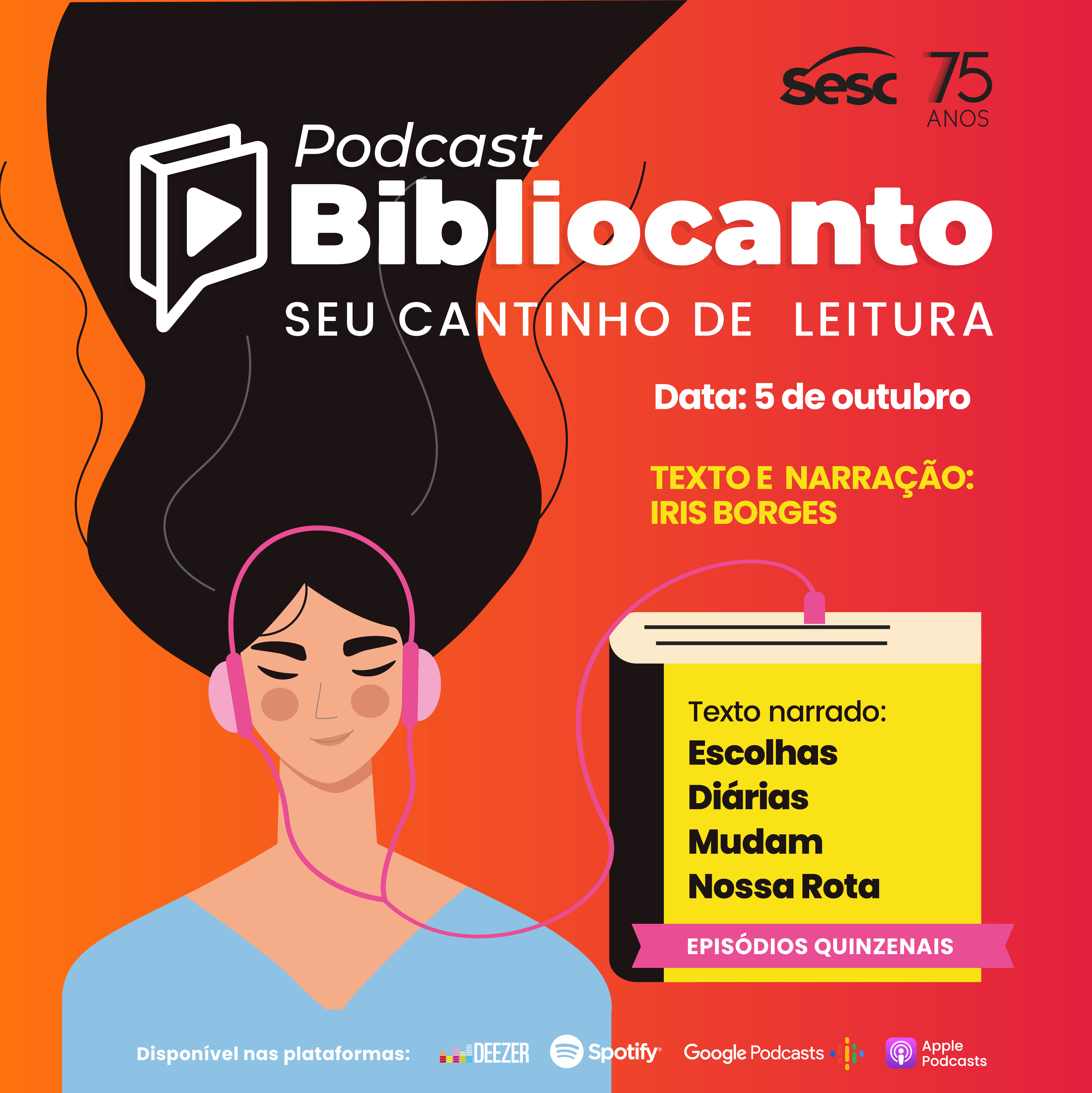 Em continuidade ao projeto podcast Bibliocanto, o Sesc-DF apresentará mais dois episódios nos dias 5 e 20 de outubro. Com o formato de narração de histórias, os podcasts são episódios quinzenais com duração de 15 a 20 minutos, temáticos e de gêneros literários distintos, com ênfase na literatura produzida na capital federal e Entorno. No episódio do dia 5, a autora Iris Borges sugere uma leitura sobre como saber se as escolhas diárias darão certo ou não. O texto deste episódio será do seu livro: Escolhas Diárias Mudam Nossa Rota. Já no dia 20 de outubro, o autor Mano Dáblio apresenta mix de poesias compiladas chamado Poesia Antibiótico. As produções estarão disponíveis nas plataformas: Deezer, Spotify, Apple Podcasts, Google Podcasts.